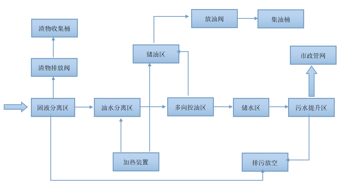 ● 出水自動(dòng)虹吸功能:污水經(jīng)油水分離倉底部流出,經(jīng)過虹吸裝置,利用虹吸原理,使得污水不斷進(jìn)入蓄水池。
